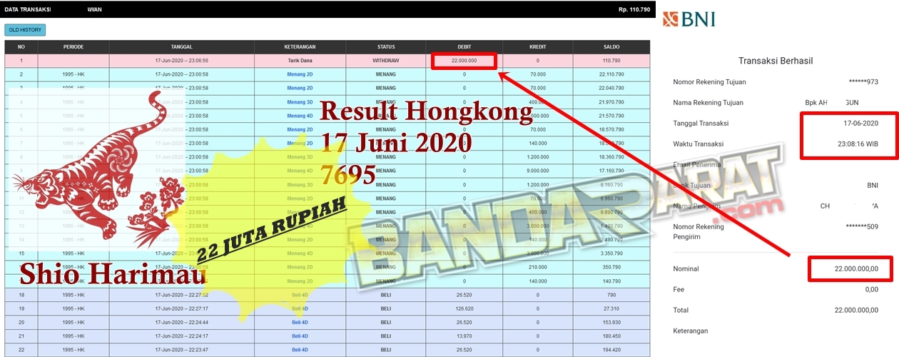 SELAMAT ATAS KEMENANGAN : Bpk. AHxxx GUxxx USER ID : AHMxxx NO RESULT Hongkong : 7695 TANGGAL 17 JUNI 2020