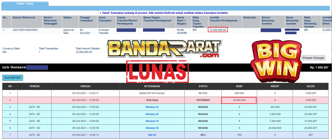 BUKTI PEMBAYARAN YANG SUDAH DI TRANSFER KE REKENING MEMBER DENGAN SUKSES SERTA BUKTI BETTINGANNYA
