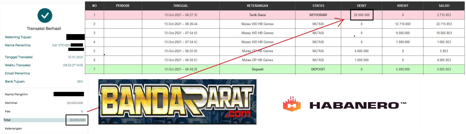 BUKTI PEMBAYARAN YANG SUDAH DI TRANSFER KE REKENING MEMBER DENGAN SUKSES SERTA BUKTI BETTINGANNYA