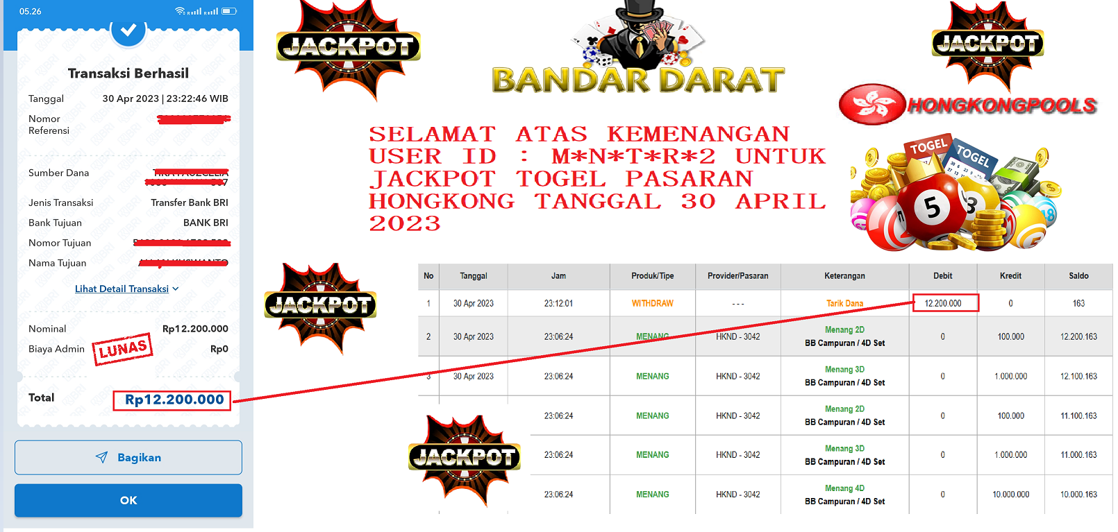 SELAMAT ATAS KEMENANGAN USER ID : M*N*T*R*2 UNTUK JACKPOT TOGEL PASARAN HONGKONG TANGGAL 30 APRIL 2023