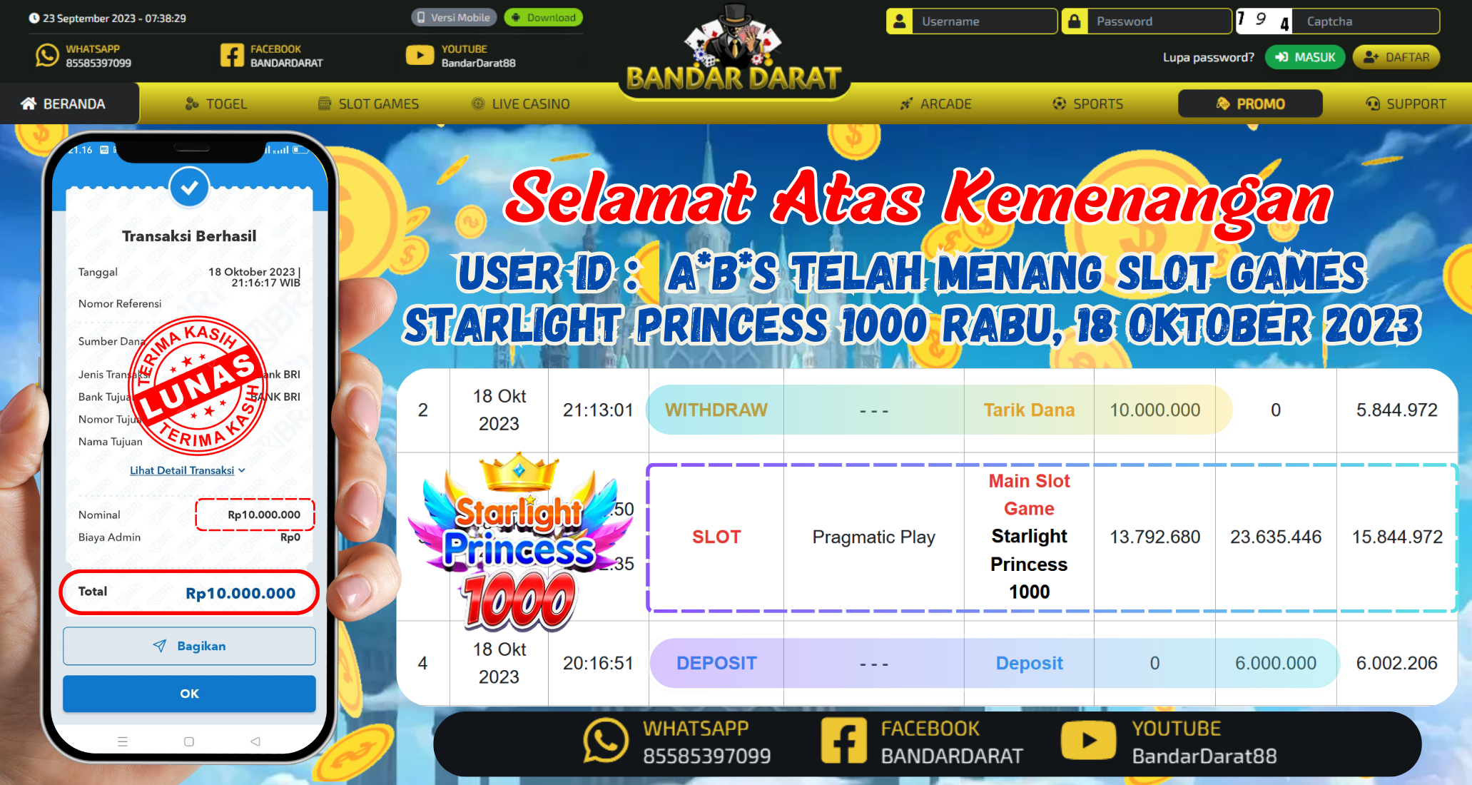 SELAMAT ATAS KEMENANGAN USER ID : A*B*S TELAH MENANG SLOT GAMES PRAGMATIC PLAY STARLIGHT PRINCESS 1000 RABU, 18 OKTOBER 2023