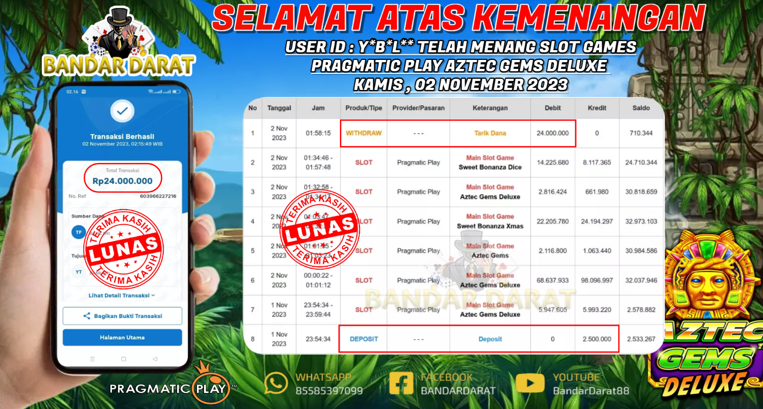 SELAMAT ATAS KEMENANGAN USER ID : Y*B*L** TELAH MENANG MESIN CUAN GAMES PRAGMATIC PLAY AZTEC GEMS DELUXE KAMIS , 02 NOVEMBER 2023