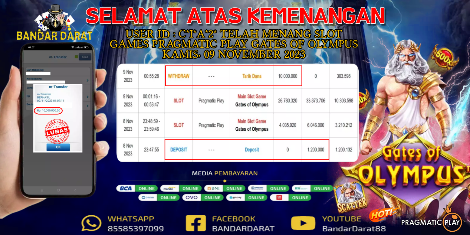 SELAMAT ATAS KEMENANGAN USER ID : C*I*A*2* TELAH MENANG SLOT GAMES PRAGMATIC PLAY GATES OF OLYMPUS KAMIS, 09 NOVEMBER 2023