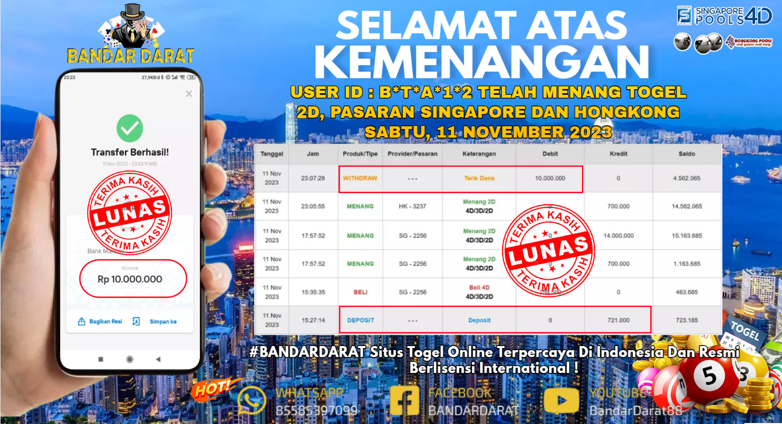 SELAMAT ATAS KEMENANGAN USER ID : B*T*A*1*2 TELAH MENANG TOGEL 2D, PASARAN SINGAPORE DAN HONGKONG SABTU, 11 NOVEMBER 2023