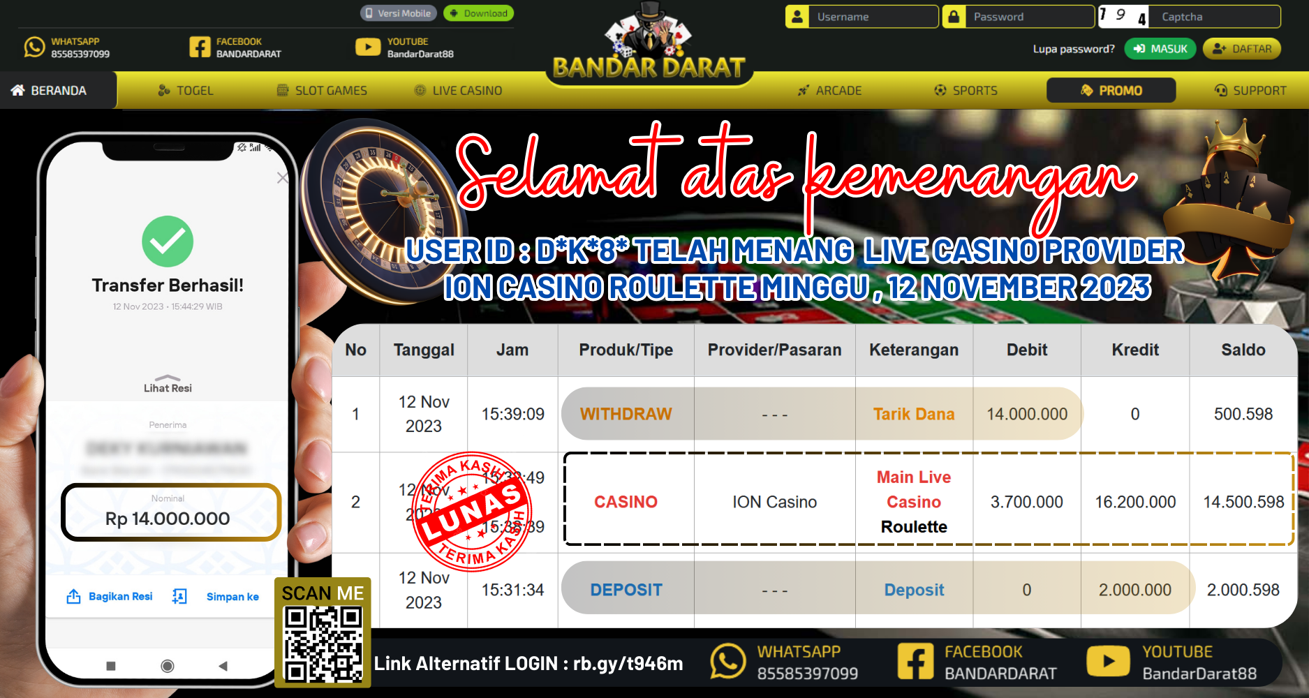 SELAMAT ATAS KEMENANGAN USER ID : D*K*8* TELAH MENANG LIVE CASINO ROULETTE PROVIDER ION CASINO PADA HARI MINGGU, 12 NOVEMBER 2023
