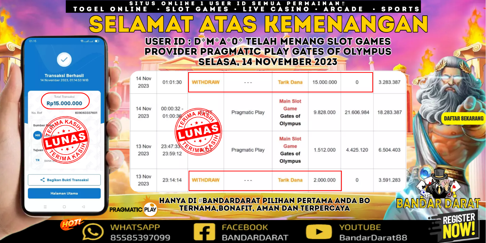 SELAMAT ATAS KEMENANGAN USER ID : D*M*A*0* TELAH MENANG SLOT GAMES PROVIDER PRAGMATIC PLAY GATES OF OLYMPUS SELASA, 14 NOVEMBER 2023