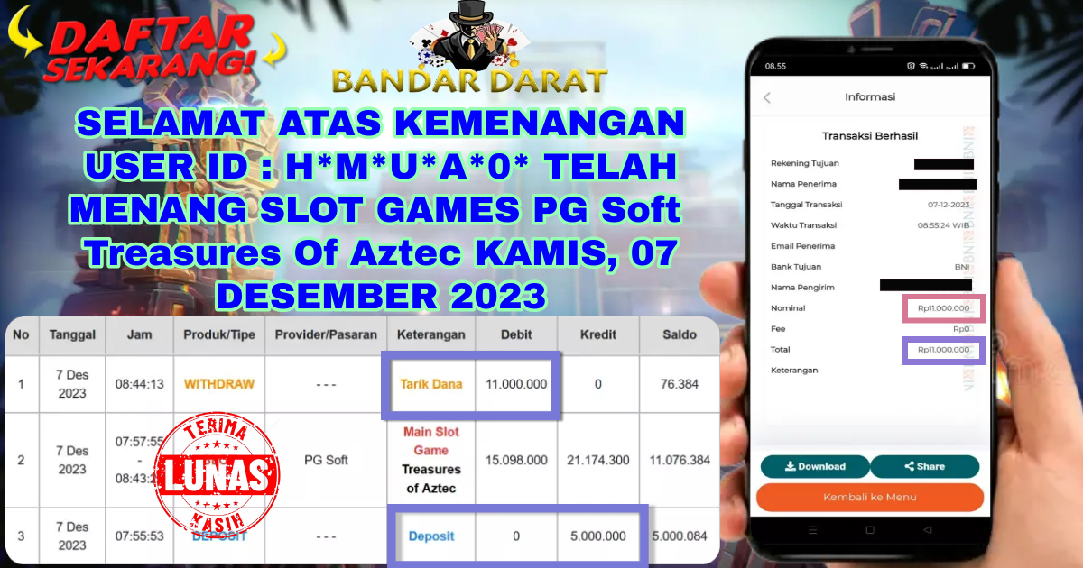 SELAMAT ATAS KEMENANGAN USER ID : H*M*U*A*0* TELAH MENANG SLOT PG Soft Treasures Of Aztec KAMIS, 07 DESEMBER 2023