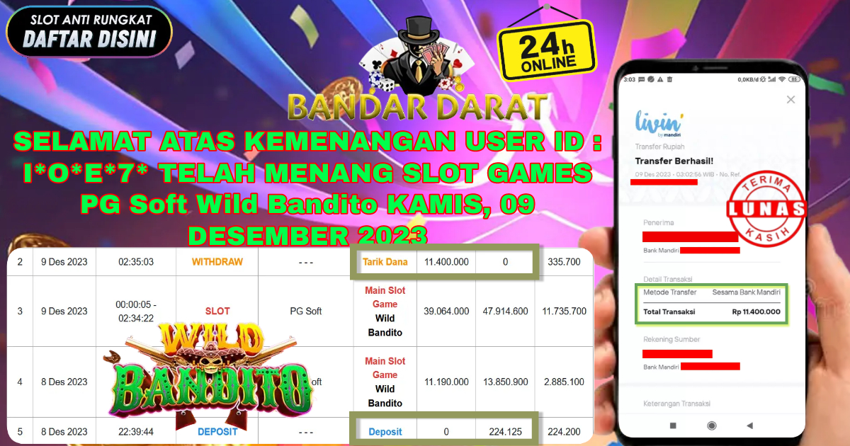 SELAMAT ATAS KEMENANGAN USER ID : H*M*U*A*0* TELAH MENANG SLOT PG Soft Wild Bandito SABTU, 09 DESEMBER 2023