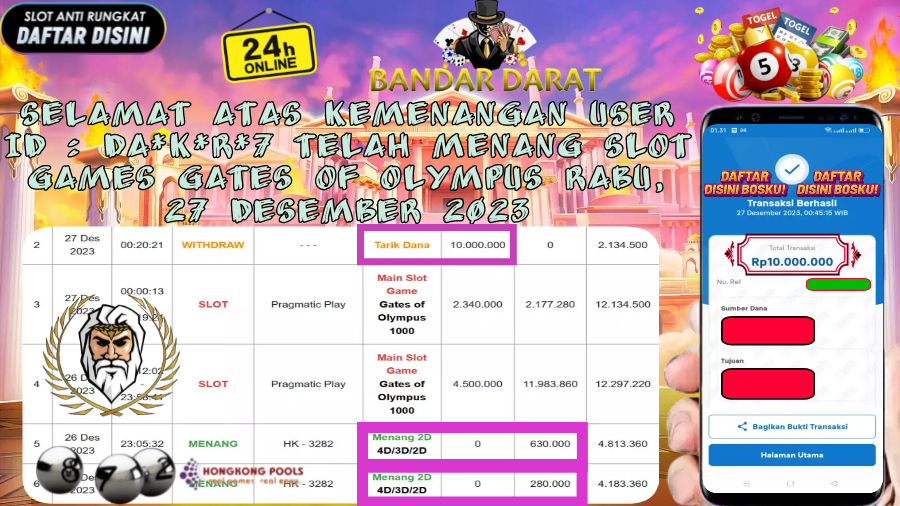 SELAMAT ATAS KEMENANGAN USER ID : D*M*A*0* TELAH MENANG SLOT GAMES GATES OF OLYMPUS RABU, 27 DESEMBER 2023