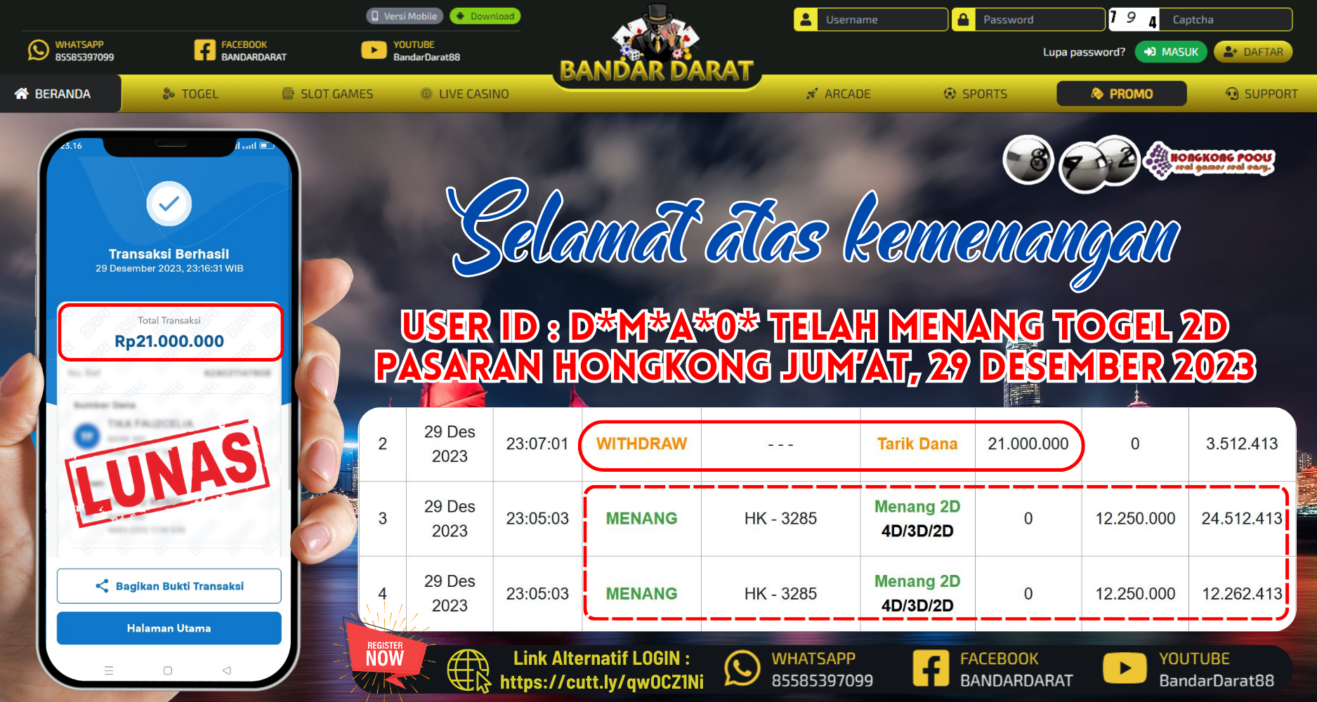 SELAMAT ATAS KEMENANGAN USER ID : D*M*A*0* TELAH MENANG TOGEL 2D PASARAN HONGKONG JUM’AT, 29 DESEMBER 2023
