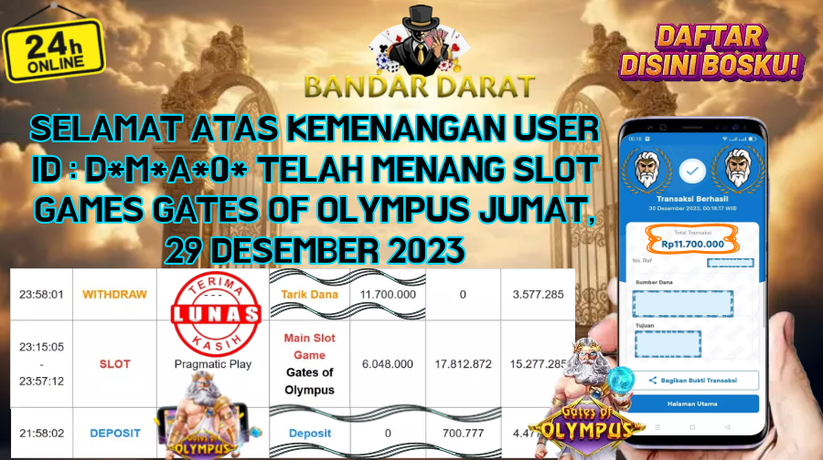 SELAMAT ATAS KEMENANGAN USER ID : D*M*A*0* TELAH MENANG SLOT GAMES GATES OF OLYMPUS JUMAT, 29 DESEMBER 2023
