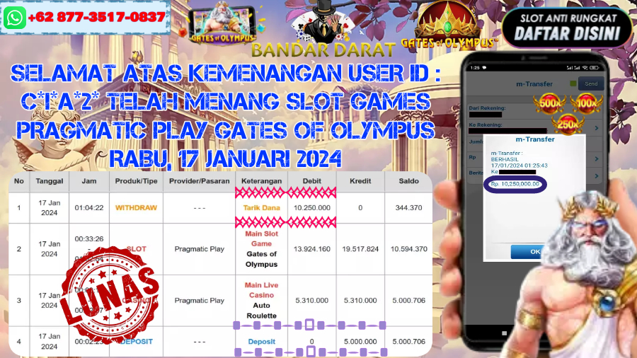 SELAMAT ATAS KEMENANGAN USER ID : C*I*A*2* TELAH MENANG SLOT GAMES PRAGMATIC PLAY GATES OF OLYMPUS RABU, 17 JANUARI 2024