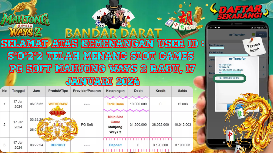 SELAMAT ATAS KEMENANGAN USER ID : S*O*2*2 TELAH MENANG SLOT GAMES PG SOFT MAHJONG WAYS 2, 17 JANUARI 2024
