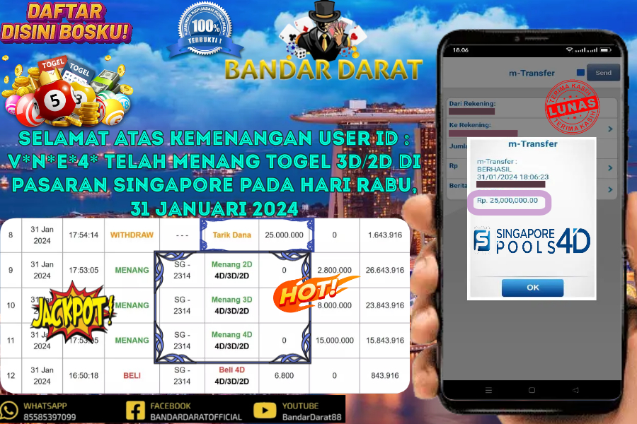 SELAMAT ATAS KEMENANGAN USER ID : V*N*E*4* TELAH MENANG TOGEL 3D/2D DI PASARAN SINGAPORE PADA HARI RABU, 31 JANUARI 2024