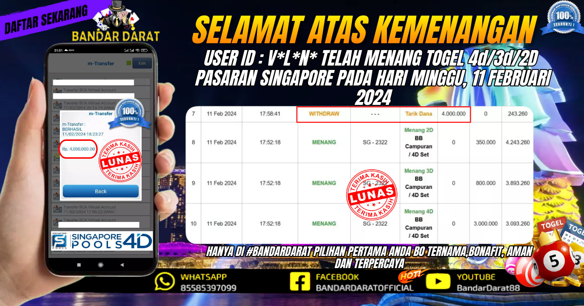 SELAMAT ATAS KEMENANGAN USER ID : V*L*N* TELAH MENANG TOGEL 4D/3D/2D PASARAN SINGAPORE MINGGU, 11 FEBRUARY 2024