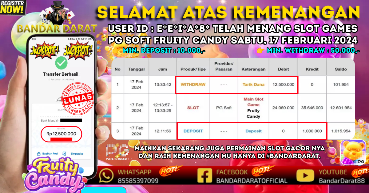 SELAMAT ATAS KEMENANGAN USER ID : E*E*I*A*8* TELAH MENANG SLOT GAMES PG SOFT FRUITY CANDY SABTU, 17 FEBRUARI 2024