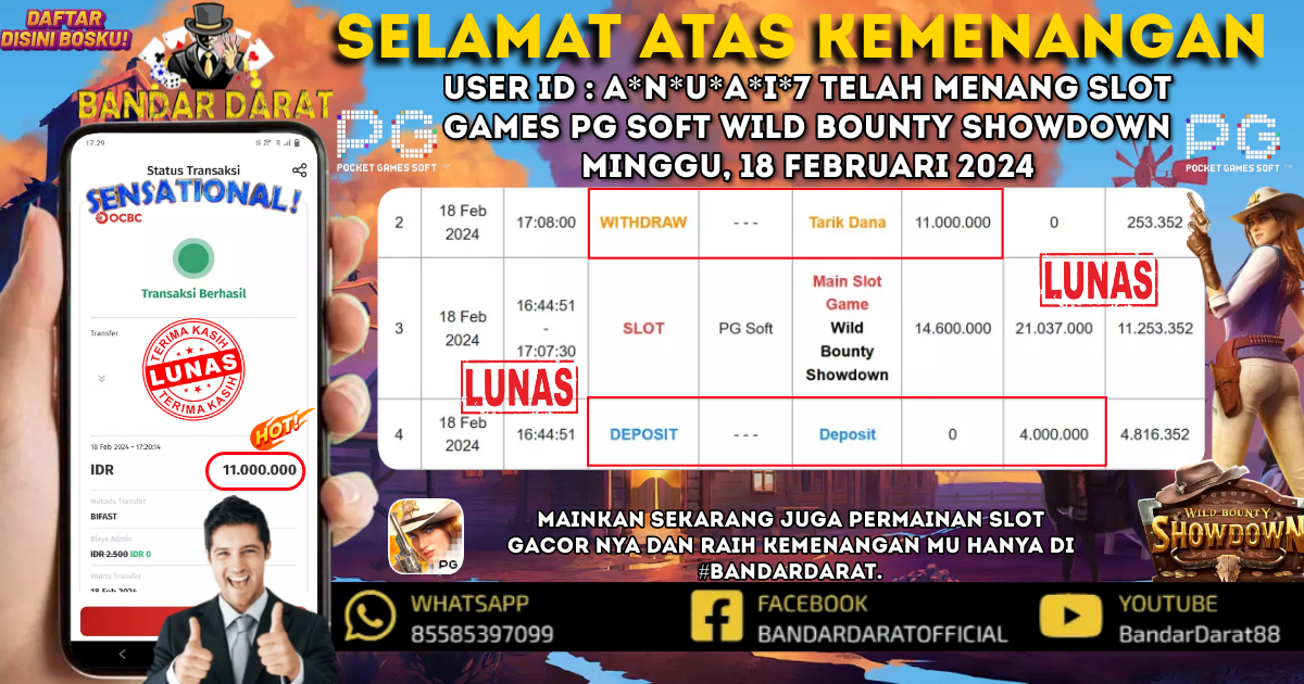 SELAMAT ATAS KEMENANGAN USER ID : A*N*U*A*I*7 TELAH MENANG SLOT GAMES PG SOFT WILD BOUNTY SHOWDOWN MINGGU, 18 FEBRUARI 2024