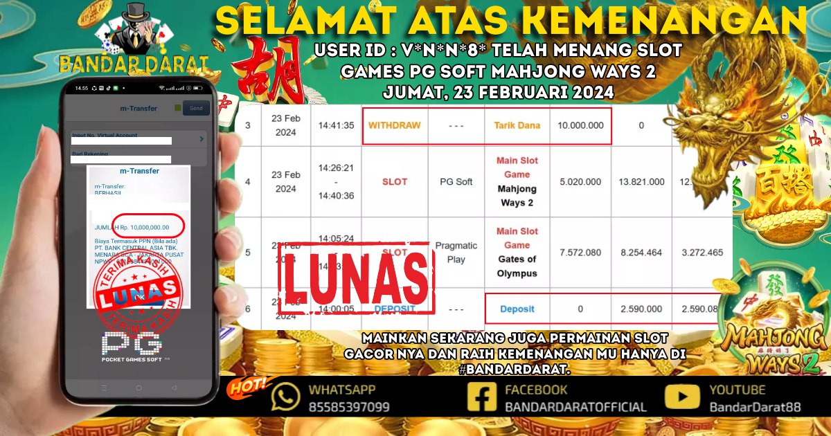 SELAMAT ATAS KEMENANGAN USER ID : V*N*N*8* TELAH MENANG SLOT GAMES PG SOFT Mahjong Ways 2 JUMAT, 23 FEBRUARI 2024