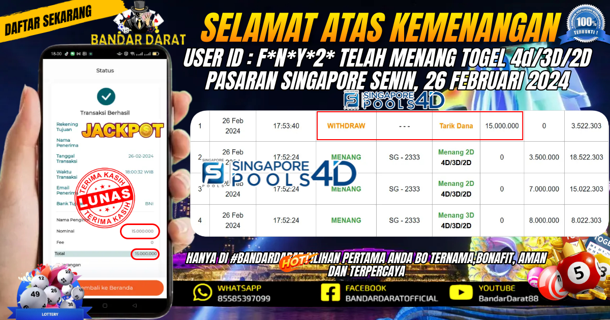 SELAMAT ATAS KEMENANGAN USER ID : F*N*Y*2* TELAH MENANG TOGEL 4D/3D/2D PASARAN SINGAPORE SENIN, 26 FEBRUARI 2024
