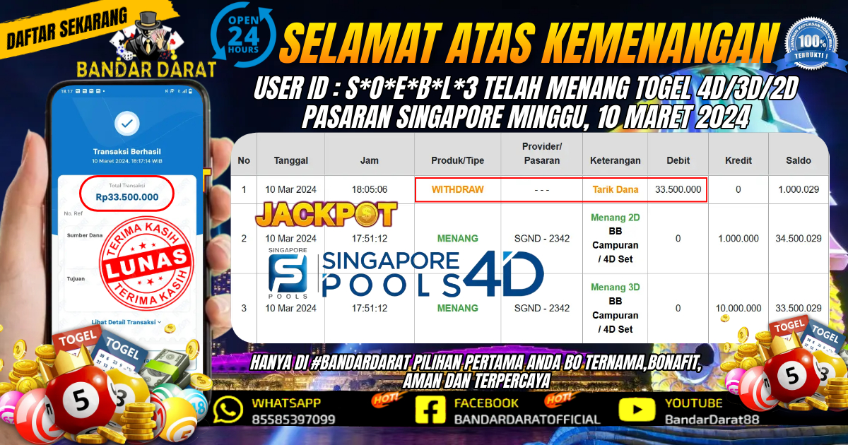 SELAMAT ATAS KEMENANGAN USER ID : S*O*E*B*L*3 TELAH MENANG TOGEL 4d/3D/2D PASARAN SINGAPORE MINGGU, 10 MARET 2024