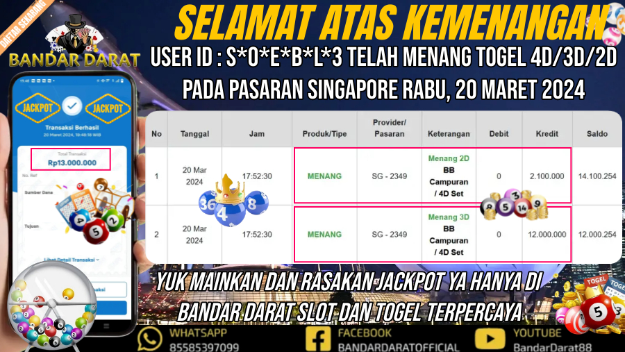 SELAMAT ATAS KEMENANGAN USER ID : S*O*E*B*L*3 TELAH MENANG TOGEL 4D/3D/2D PASARAN SINGAPORE RABU, 20 MARET 2024