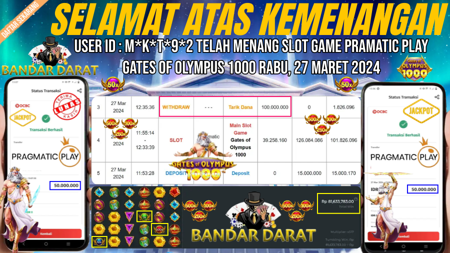 SELAMAT ATAS KEMENANGAN USER ID : M*K*T*9*2 TELAH MENANG SLOT GAMES PRAGMATIC PLAY GATES OF OLYMPUS 1000 RABU, 27 MARET 2024