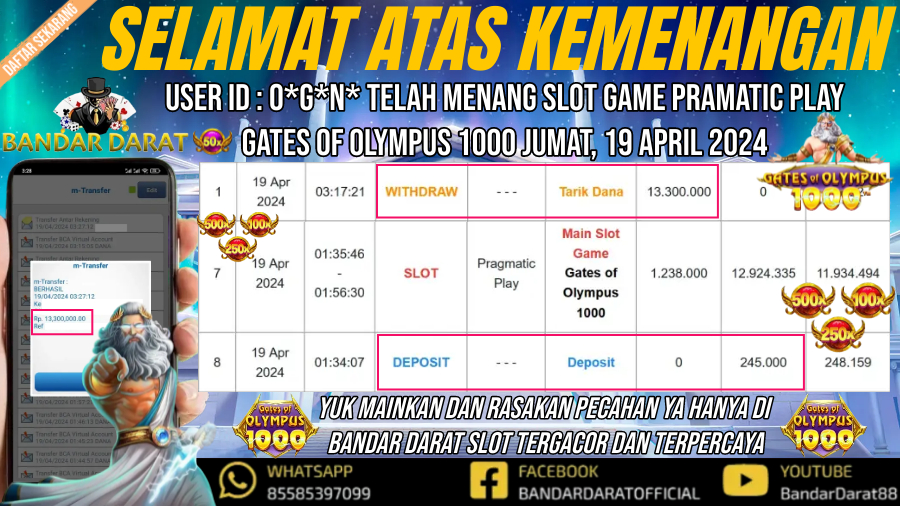 SELAMAT ATAS KEMENANGAN USER ID : O*G*N* TELAH MENANG SLOT GAMES PRAGMATIC PLAY GATES OF OLYMPUS 1000 JUMAT, 19 APRIL 2024