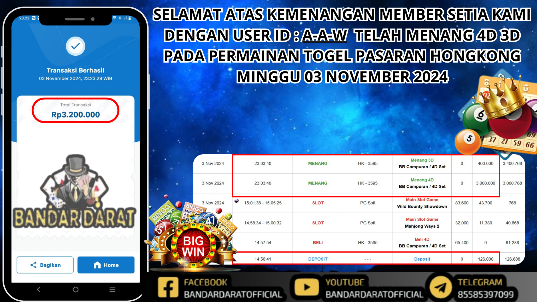 SELAMAT ATAS KEMENANGAN MEMBER SETIA KAMI DENGAN USER ID : A-A-W TELAH MENANG 4D 3D PADA PERMAINAN TOGEL PASARAN HONGKONG MINGGU 03 NOVEMBER 2024