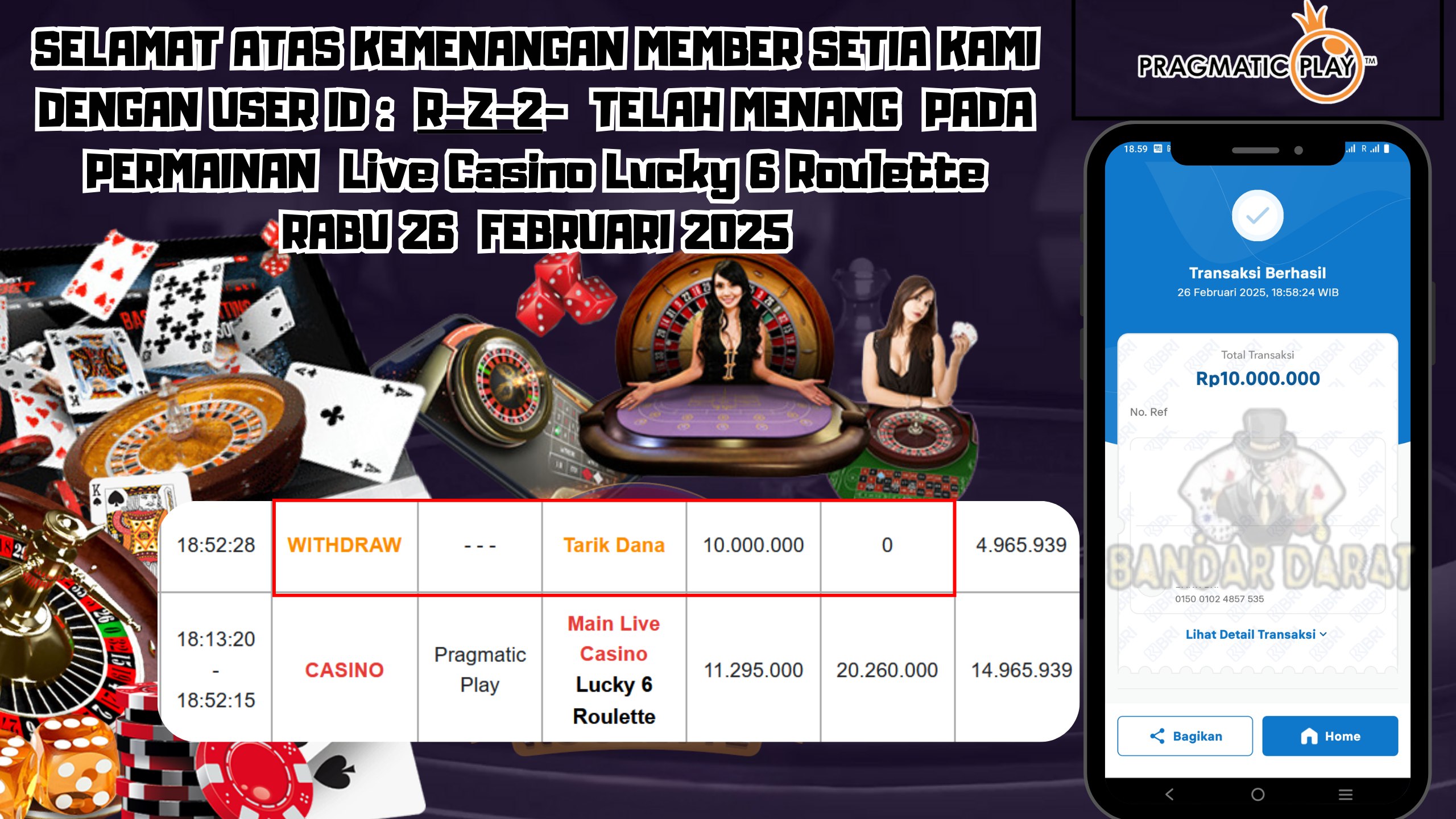 SELAMAT ATAS KEMENANGAN MEMBER SETIA KAMI DENGAN USER ID : R-Z-2- TELAH MENANG PADA PERMAINAN Live Casino Lucky 6 Roulette RABU 26 FEBRUARI 2025