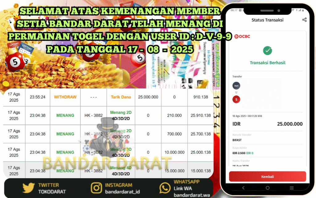 SELAMAT ATAS KEMENANGAN MEMBER SETIA BANDAR DARAT TELAH MENANG DI PERMAINAN TOGEL DENGAN USER ID : D-V-9-9 PADA TANGGAL 17 – 08 – 2025
