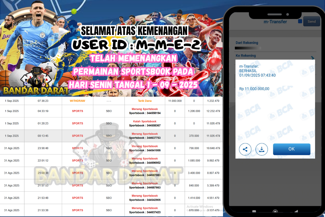 SELAMAT ATAS KEMENANGAN USER ID : M-M-E-2 TELAH MEMENANGKAN PERMAINAN SPORTSBOOK PADA HARI SENIN TANGAL 1 – 09 – 2025