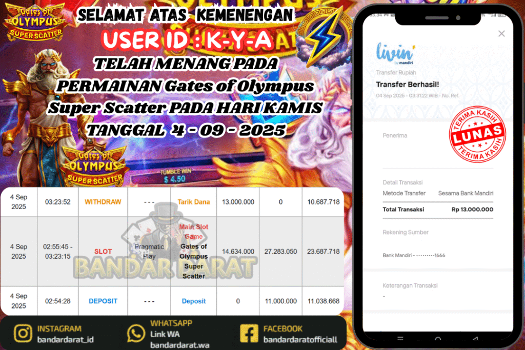 SELAMAT ATAS KEMENENGAN USER ID : K-Y-A TELAH MENANG PADA PERMAINAN Gates of Olympus Super Scatter PADA HARI KAMIS TANGGAL 4 – 09 – 2025
