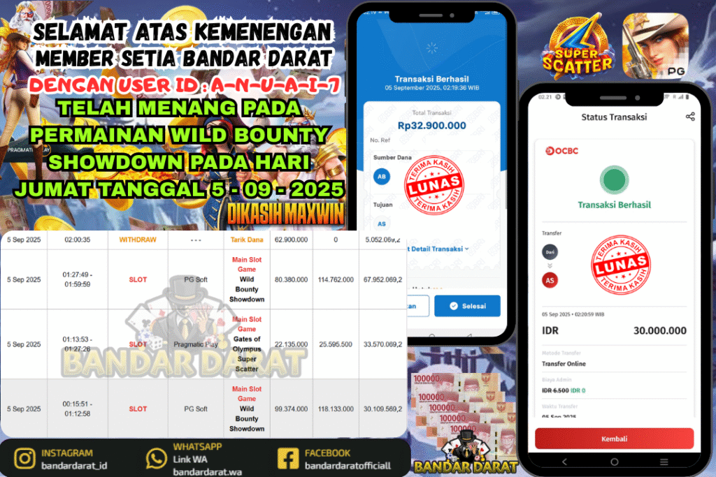 SELAMAT ATAS KEMENENGAN MEMBER SETIA BANDAR DARAT DENGAN USER ID : A-N-U-A-I-7 TELAH MENANG PADA PERMAINAN WILD BOUNTY SHOWDOWN PADA HARI JUMAT TANGGAL 5 – 09 – 2025