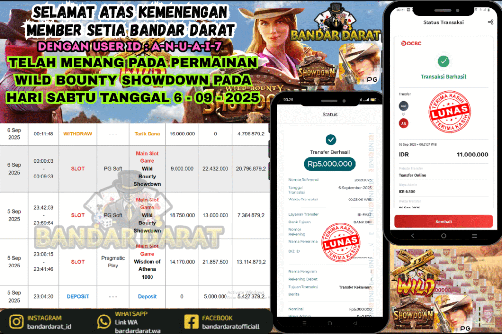 SELAMAT ATAS KEMENENGAN MEMBER SETIA BANDAR DARAT DENGAN USER ID : A-N-U-A-I-7 TELAH MENANG PADA PERMAINAN WILD BOUNTY SHOWDOWN PADA HARI SABTU TANGGAL 6 – 09 – 2025