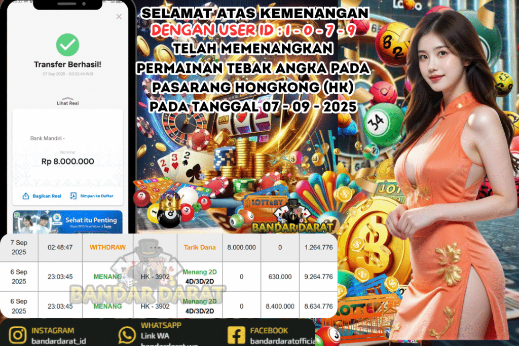 SELAMAT ATAS KEMENANGAN DENGAN USER ID : 1 – 0 – 7 – 9 TELAH MEMENANGKAN PERMAINAN TEBAK ANGKA PADA PASARANG HONGKONG (HK) PADA TANGGAL 07 – 09 – 2025
