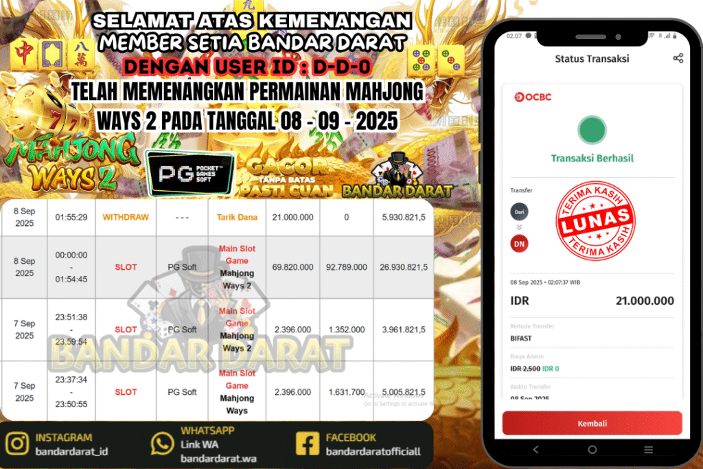 SELAMAT ATAS KEMENANGAN MEMBER SETIA BANDAR DARAT DENGAN USER ID : D-D-0 TELAH MEMENANGKAN PERMAINAN MAHJONG WAYS 2 PADA TANGGAL 08 – 09 – 2025