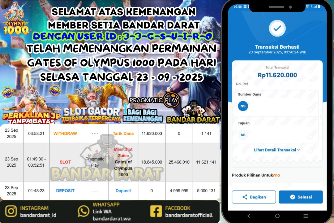 SELAMAT ATAS KEMENANGAN MEMBER SETIA BANDAR DARAT DENGAN USER ID : 3-3-G-S-U-I-R-O TELAH MEMENANGKAN PERMAINAN GATES OF OLYMPUS 1000 PADA HARI SELASA TANGGAL 23 – 09 – 2025