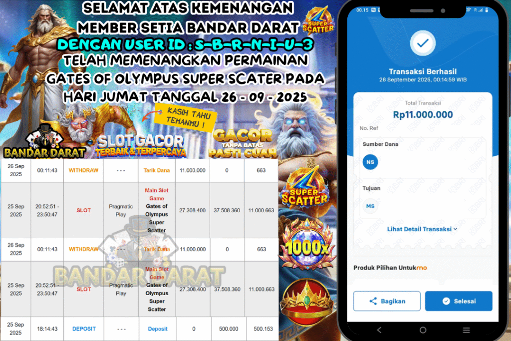 SELAMAT ATAS KEMENANGAN MEMBER SETIA BANDAR DARAT DENGAN USER ID : S-B-R-N-I-U-3 TELAH MEMENANGKAN PERMAINAN GATES OF OLYMPUS SUPER SCATER PADA HARI JUMAT TANGGAL 26 – 09 – 2025