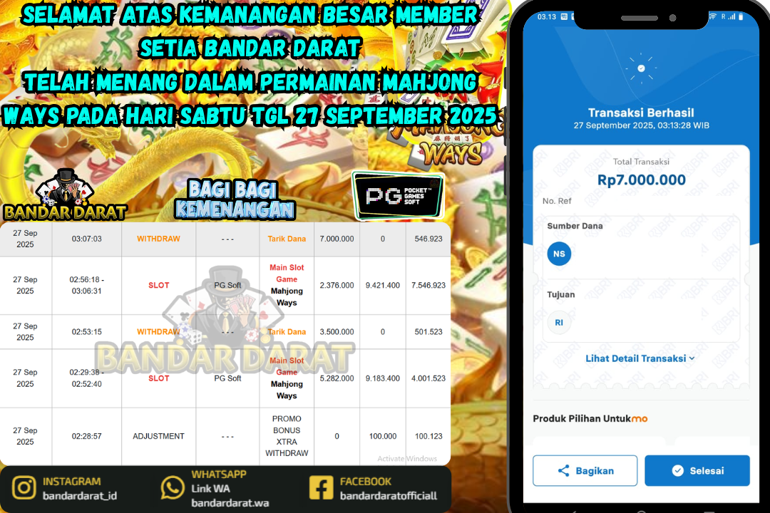 SELAMAT ATAS KEMENANGAN BESAR MEMBER SETIA BANDAR DARAT TELAH MENANG DALAM PERMAINAN MAHJONG WAYS PADA HARI SABTU TGL 27 SEPTEMBER 2025