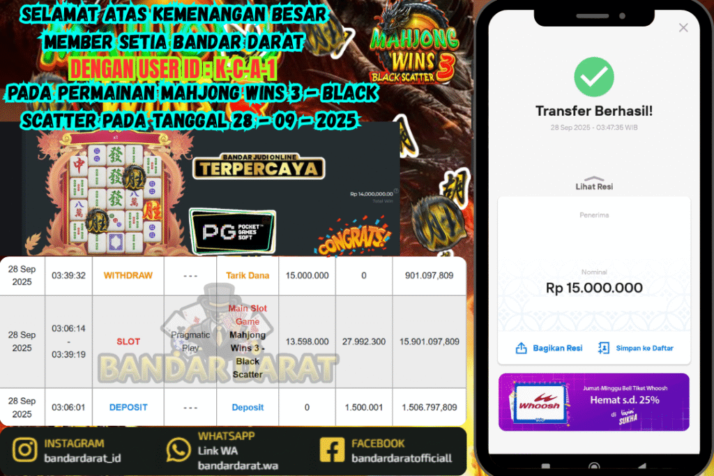 SELAMAT ATAS KEMNANGAN BESAR MEMBER SETIA BANDAR DARAT DENGAN USER ID : K-C-A-1 PADA PERMAINAN Mahjong Wins 3 – Black Scatter PADA TANGGAL 28 – 09 – 2025
