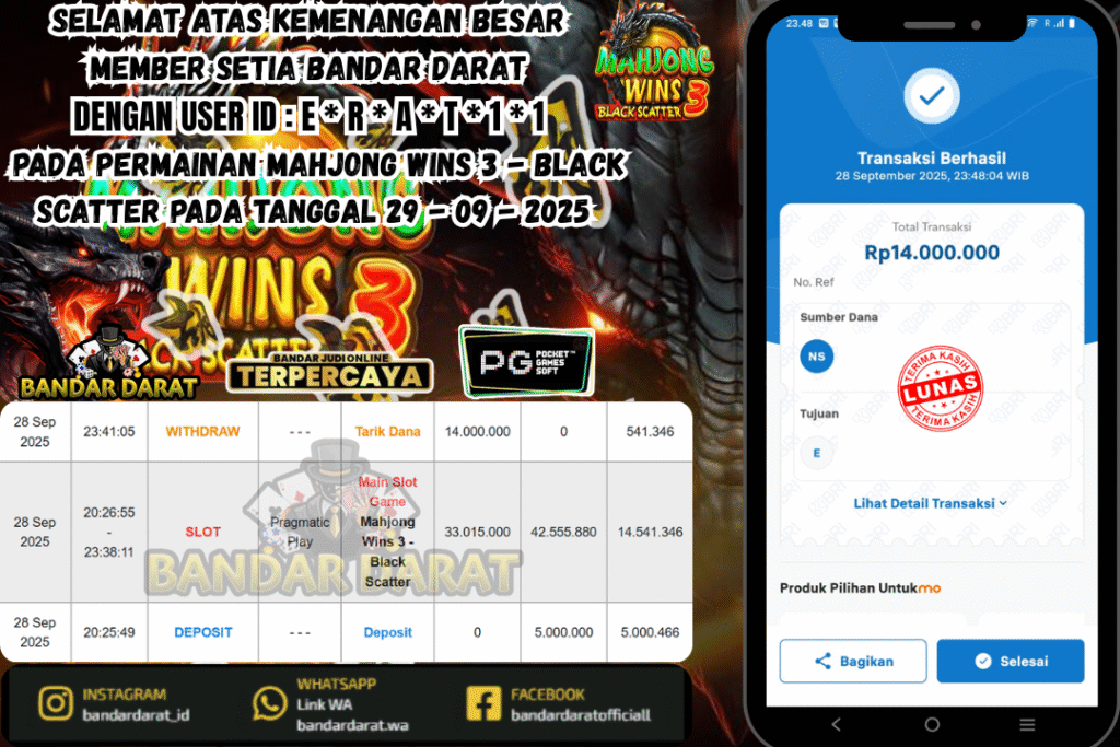 SELAMAT ATAS KEMENANGAN BESAR MEMBER SETIA BANDAR DARAT DENGAN USER ID : E – R – A – T – 1 – 1 PADA PERMAINAN Mahjong Wins 3 – Black Scatter PADA TANGGAL 29 – 09 – 2025