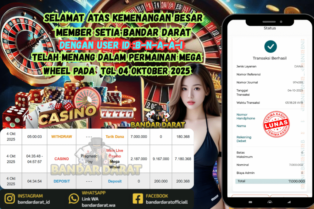 SELAMAT ATAS KEMENANGAN BESAR MEMBER SETIA BANDAR DARAT DENGAN USER ID :B-N-A-A-I TELAH MENANG DALAM PERMAINAN MEGA WHEEL PADA TGL 04 OKTOBER 2025