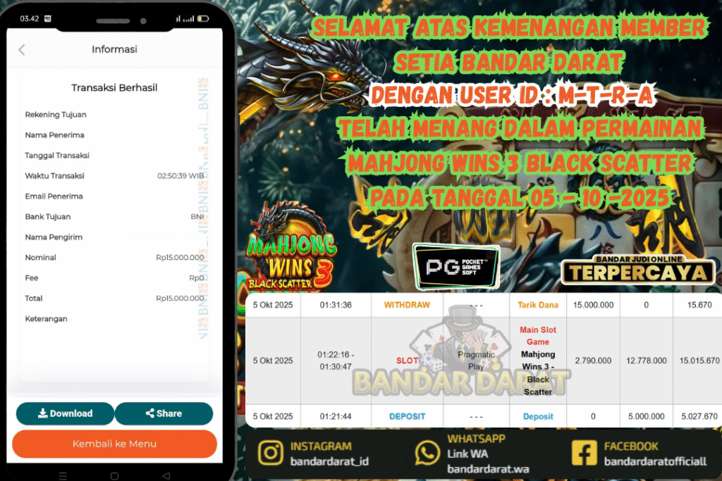 SELAMAT ATAS KEMENANGAN MEMBER SETIA BANDAR DARAT DENGAN USER ID : M-T-R-A TELAH MENANG DALAM PERMAINAN MAHJONG WINS 3 BLACK SCATTER PADA TANGGAL 05 – 10 -2025