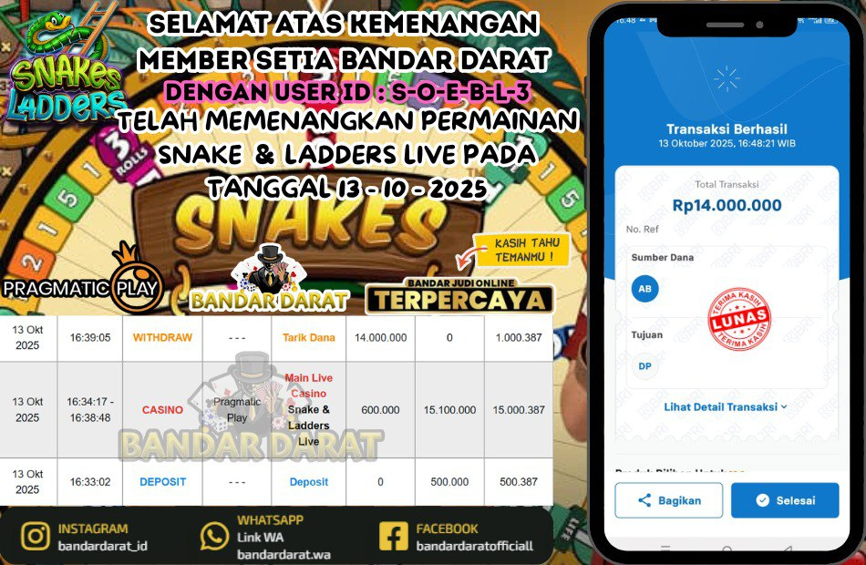 SELAMAT ATAS KEMENANGAN MEMBER SETIA BANDAR DARAT DENGAN USER ID : S-O-E-B-L-3 TELAH MEMENANGKAN PERMAINAN SNAKE & LADDERS LIVE PADA TANGGAL 13 – 10 – 2025