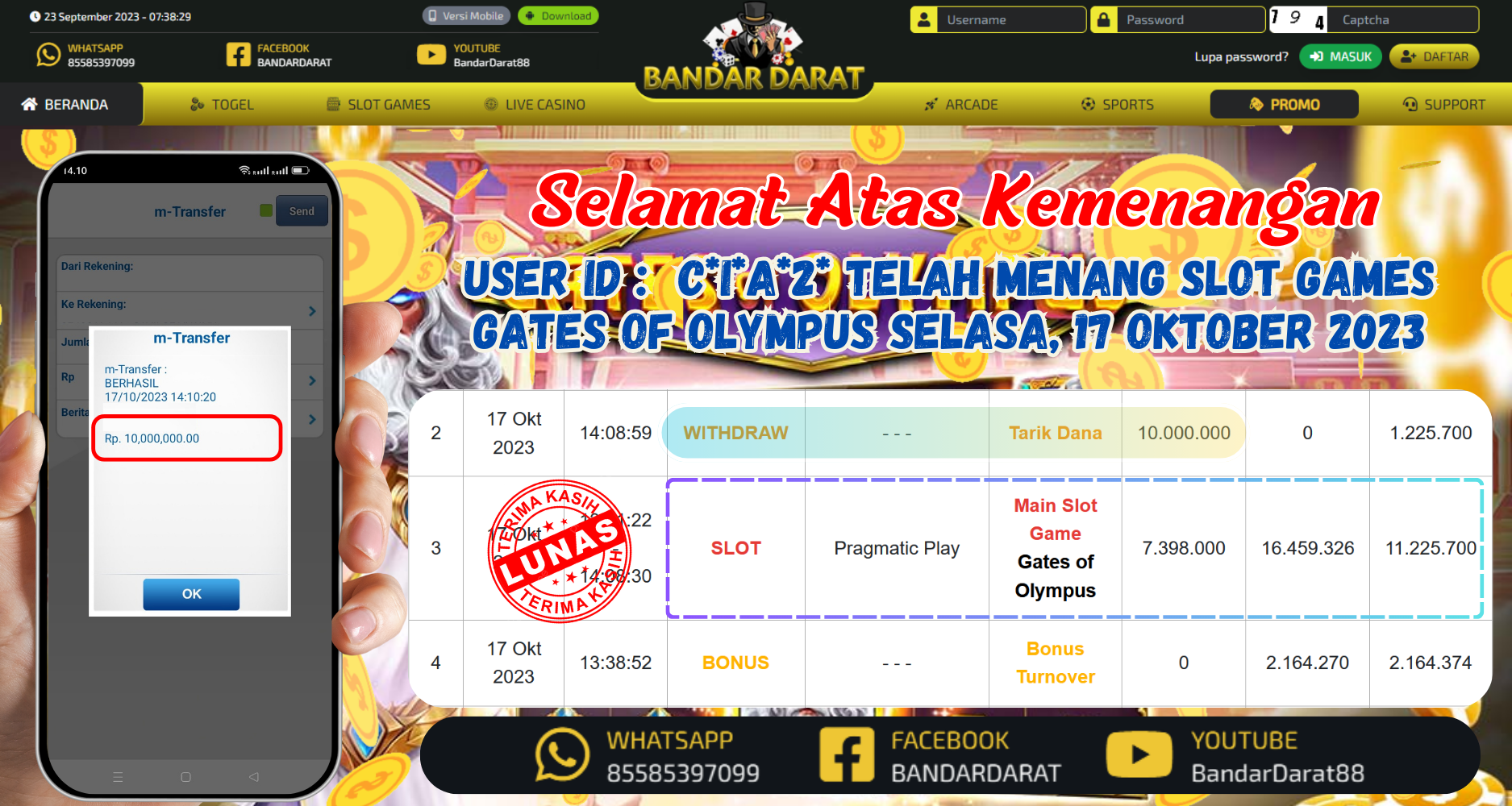 SELAMAT ATAS KEMENANGAN USER ID : C*I*A*2* TELAH MENANG SLOT GAMES GATES OF OLYMPUS SELASA, 17 OKTOBER 2023